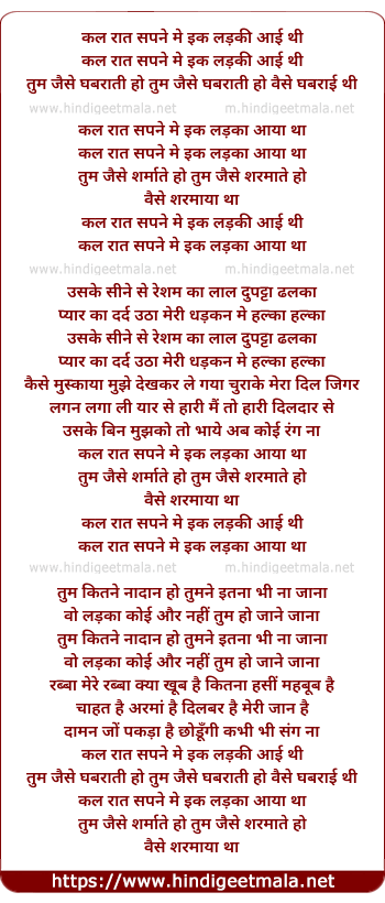 Lyrics of Kal Raat Sapne Me - कल रात सपने में