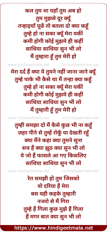 Lyrics of Kal Tum The Yaha (Remix) - कल तुम था यहाँ तुम अब हो