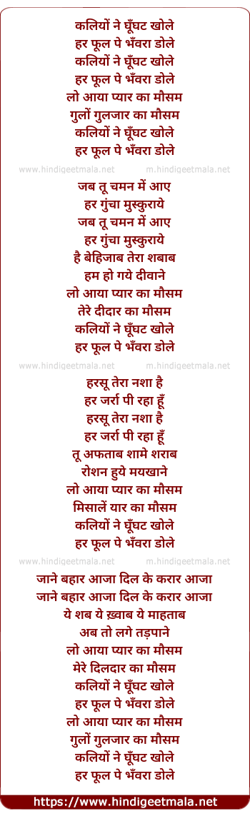 Lyrics of Kaliyo Ne Ghunghat Khole - कलियों ने घूँघट खोले