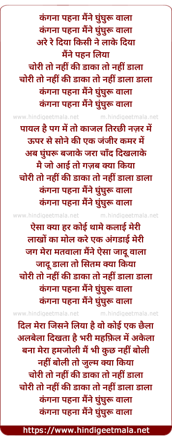 Lyrics of Kangna Pehna Maine Ghungru Wala - कंगना पहना मैंने घुंघुरू वाला