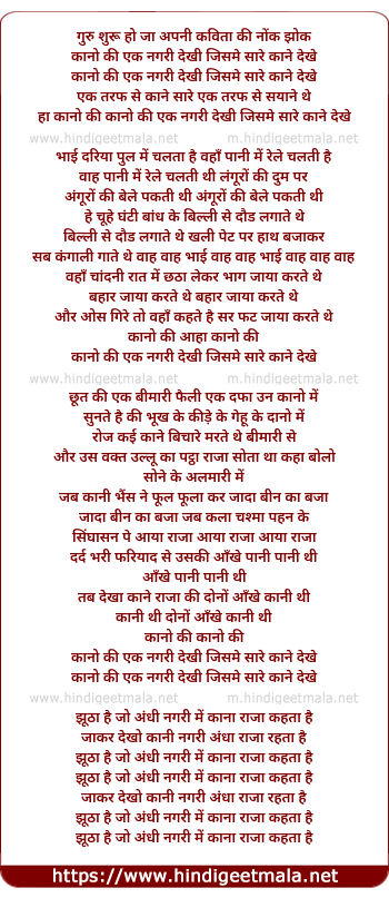 Lyrics of Kanon Ki Ek Nagari Dekhi - कानो की एक नगरी देखी