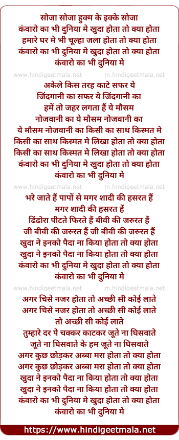 Lyrics of Kanwaro Ka Bhi Duniya Me Khuda Hota To Kya Hota - कंवारो का भी दुनिया मे खुदा होता तो क्या होता