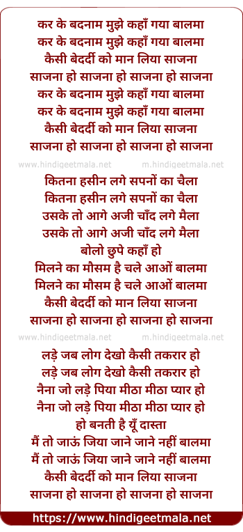 Lyrics of Kar Ke Badnam Mujhe Kaha Gaya Balm - कर के बदनाम मुझे कहाँ गया बालमा