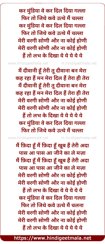 Lyrics of Kar Mundiya We Kar Dil Diya Gala - कर मुंडिया वे कर दिल दिया गल्ला