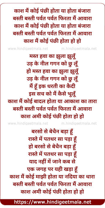Lyrics of Kash Main Koi Panchhi Hota - काश मैं कोई पंछी होता