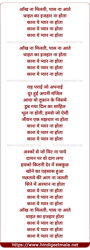 Lyrics of Kash Ye Pyaar Na Hota (Female) - आँख ना मिलती, पास ना आते