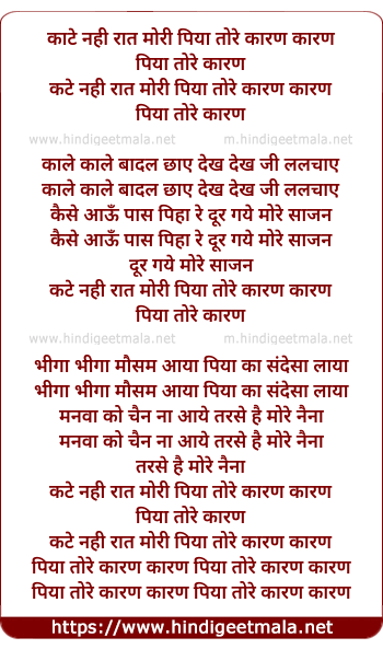 Lyrics of Kate Naahee Raat Moree - काटे नही रात मोरी पिया तोरे कारण कारण