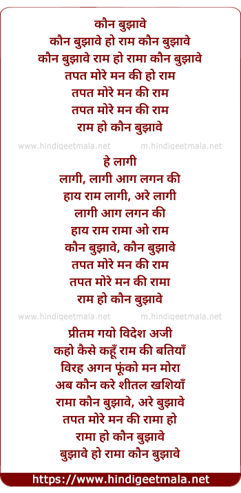 Lyrics of Kaun Bujhave Ram Tapat More Man Ki - कौन बुझावे राम तपत मोरे मन की