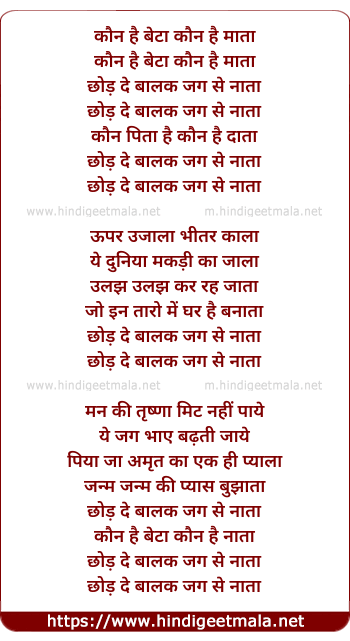 Lyrics of Kaun Hai Beta Kaun Hai Mata Chhod De Balak Jag Se Naata - कौन है बेटा कौन है माता छोड़ दे बालक जग से नाता