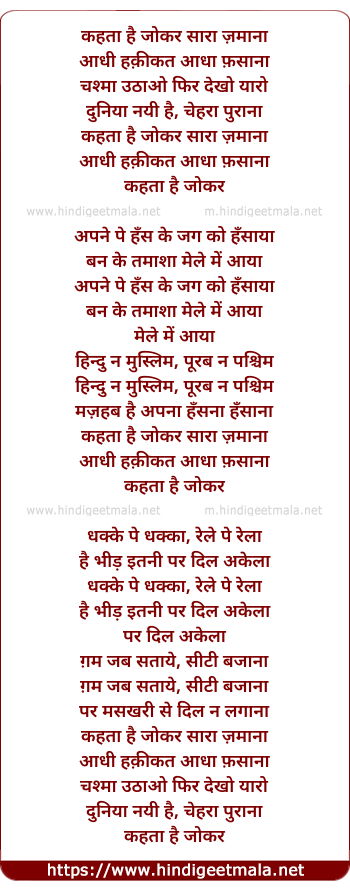 Lyrics of Kehta Hai Joker Saara Jamana - कहता है जोकर सारा ज़माना