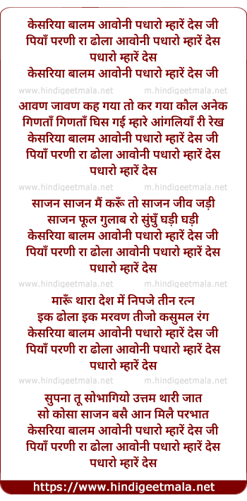 Lyrics of Kesariya Balam (Rukma Bai) - केसरिया बालम