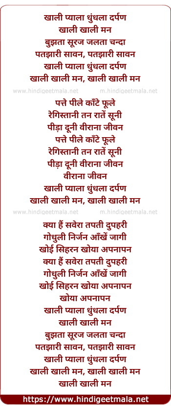 Lyrics of Khaali Pyaalaa Dhundhalaa Darpan - खाली प्याला धुंधला दर्पण
