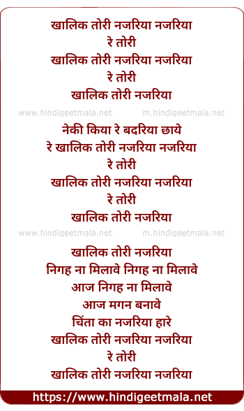 Lyrics of Khaalik Tori Najariya - खालिक तोरी नजरिया नजरिया