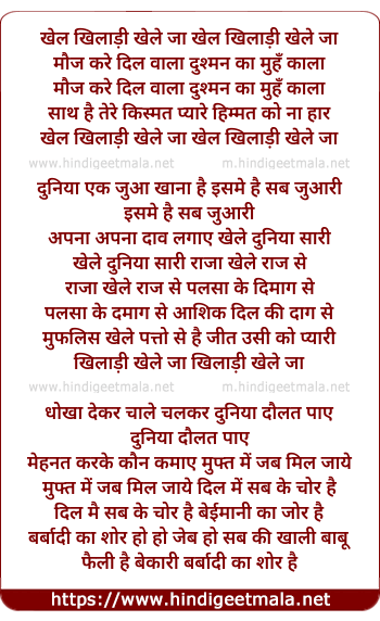 Lyrics of Khel Khiladi Khele Ja Mauj Kare Dil Vala Dushman Ka Muh Kala - खेल खिलाड़ी खेले जा मौज करे दिल वाला दुश्मन का मुह काला