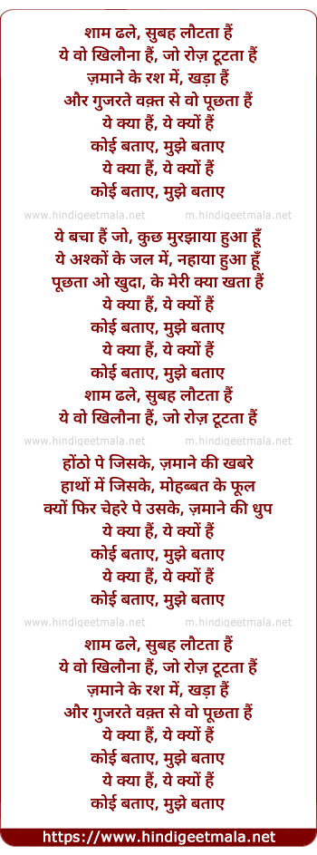 Lyrics of Khilona - शाम ढले, सुबह लौटता हैं
