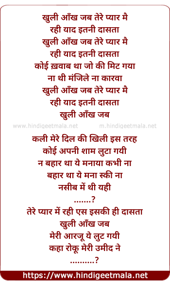 Lyrics of Khuli Ankh Jab Tere Pyar Me