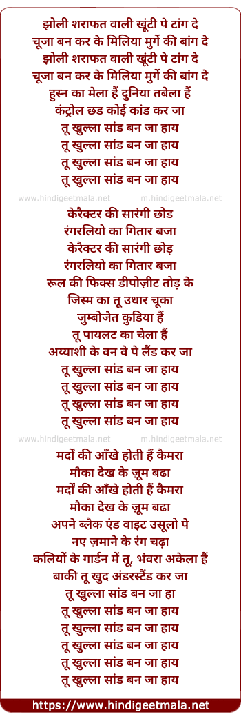 Lyrics of Khullaa Sand Ban Ja - खुल्ला सांड बन जा