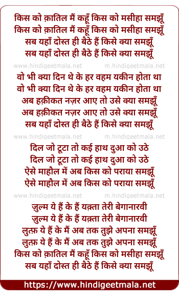 Lyrics of Kisako Qaatil Main Kahun Kis Ko Masihaa Samajhun - किस को क़ातिल मैं कहूँ किस को मसीहा समझूँ