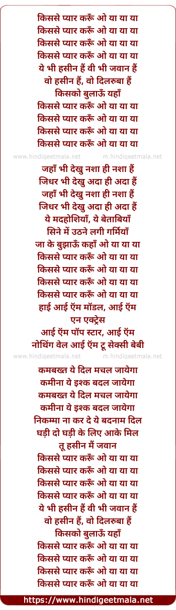 Lyrics of Kisase Pyaar Karu O Ya Ya Ya - किससे प्यार करूँ ओ या या या किससे प्यार करूँ ओ या या या