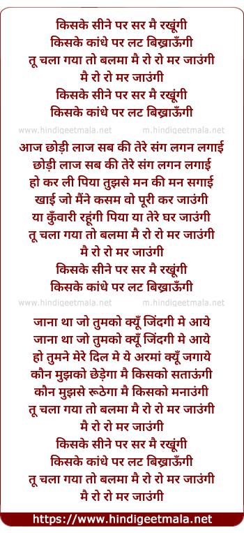 Lyrics of Kiske Seene Par Sar Mai Rakhungi - किसके सीने पर सर मै रखूंगी