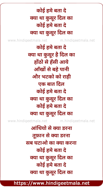 Lyrics of Koi Hame Bata De - कोई हमे बता दे क्या था कुसूर दिल का