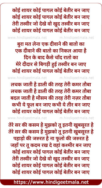 Lyrics of Koi Shair Koi Pagal Koi Beteer Ban Jaye - कोई शायर कोई पागल कोई बेतीर बन जाए