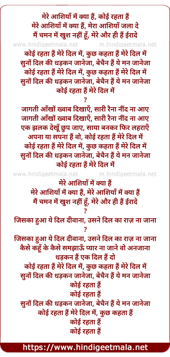 Lyrics of Koyee Rehta Hai Mere Dil Me - मेरे आशियाँ में क्या हैं, कोई रहता हैं