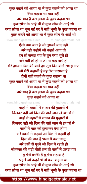 Lyrics of Kuch Kehne Ko Aaya Tha, Kya Kehna Tha Yaad Nahi - कुछ कहने को आया था मै कुछ कहने को आया था याद नहीं