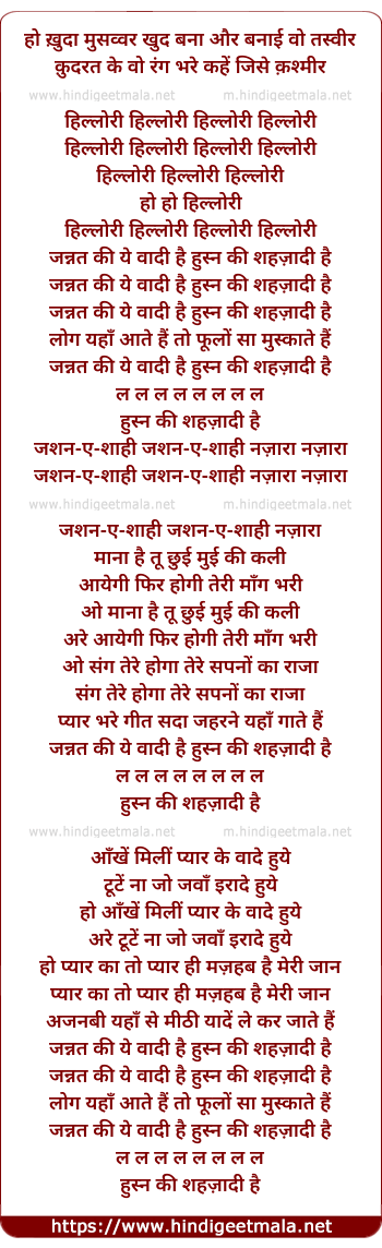 Lyrics of Kuda Musavvar Khud Bana, Hillori Jannat Kii Ye Wadi Hai - ख़ुदा मुसव्वर खुद बना, हिल्लोरी जन्नत कि ये वादी है