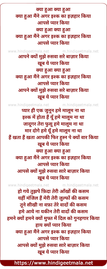 Lyrics of Kya Hua Maine Agar Ishq Ka Izhaar Kiya, Aapse Pyar Kiya - क्या हुआ मैंने अगर इश्क का इज़हार किया, आपसे प्यार किया