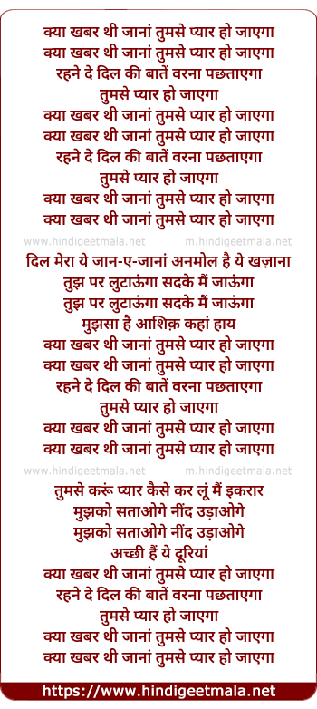 Lyrics of Kya Khabar Thi Jaana Tujhse Pyar Ho Jayega - क्या खबर थी जाना तुमसे प्यार हो जाएगा