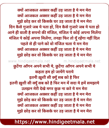 kyo ajkal aksar kahi ud jata hai ye man mera