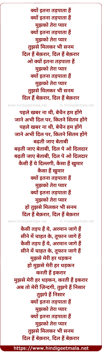 Lyrics of Kyon Itna Tadpata Hai - क्यों इतना तड़पाता हैं