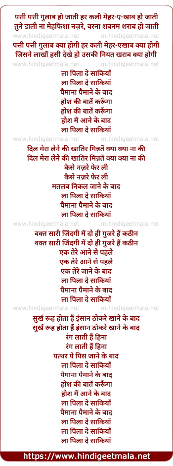 Lyrics of La Pila De Sakiya Paimaana Paimaane Ke Baad - ला पिला दे साकियाँ पैमाना पैमाने के बाद