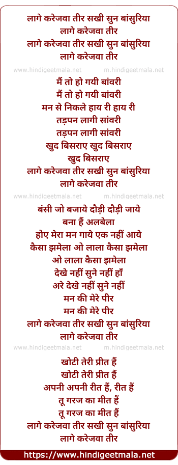 Lyrics of Lage Karejwa Teer Sakhi - लागे करेजवा तीर सखी