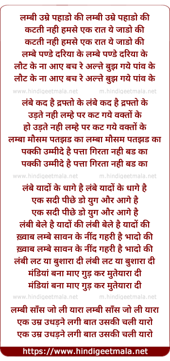 Lyrics of Lambi Umre - लम्बी उम्रे पहाडो की लम्बी उम्रे पहाडो की