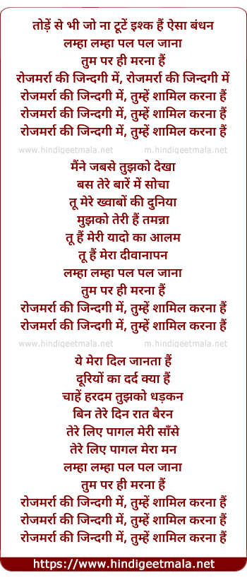 Lyrics of Lamha Lamha Pal Pal Jaana - लम्हा लम्हा पल पल जाना