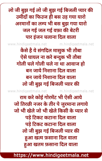 Lyrics of Lo Ji Bujh Gayi Bijli Pyar Ki - लो जी बुझ गई बिजली प्यार की