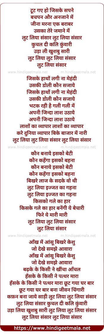 Lyrics of Lut Liya Sansar - लुट लिया संसार