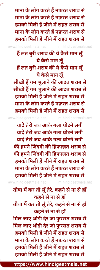 Lyrics of Maana Ke Log Karte Hai Nafarat Sharaab Se - माना के लोग करते हैं नफ़रत शराब से