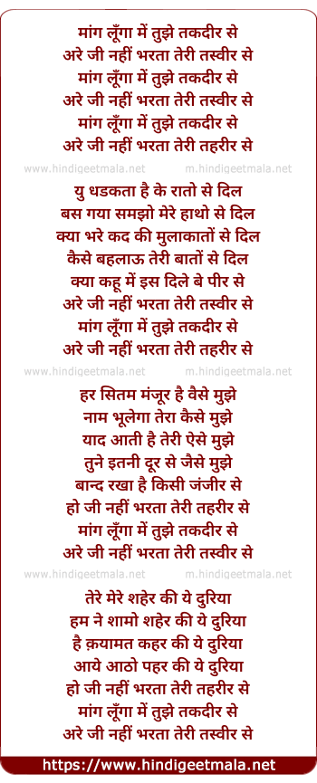 Lyrics of Maang Lunga Mai Tujhe Taqdir Se - मांग लूँगा में तुझे तकदीर से
