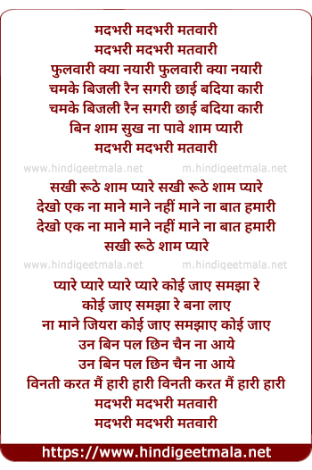 Lyrics of Madbhari Madbhari Matwari - मदभरी मदभरी मतवारी
