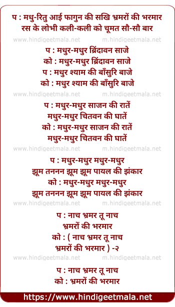 Lyrics of Madhu Ritu Aai Phaagun Ki Sakhi - प : मधु-रितु आई फागुन की सखि भ्रमरों की भरमार