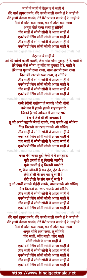 Lyrics of Mahee Ve Mahee Ve - माही वे माही वे