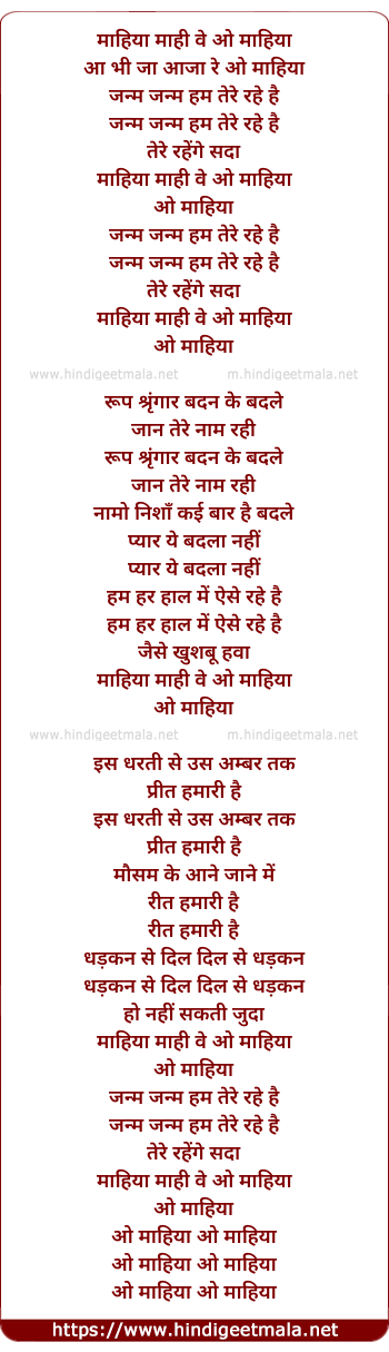 Lyrics of Mahiya Mahi Ve O Mahiya - माहिया माही वे ओ माहिया