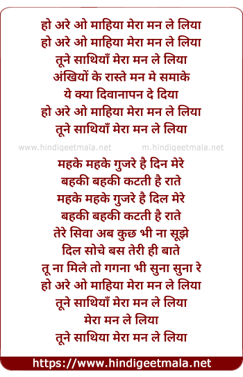 Lyrics of Mahiya Mera Man Le Liya - माहिया मेरा मन ले लिया