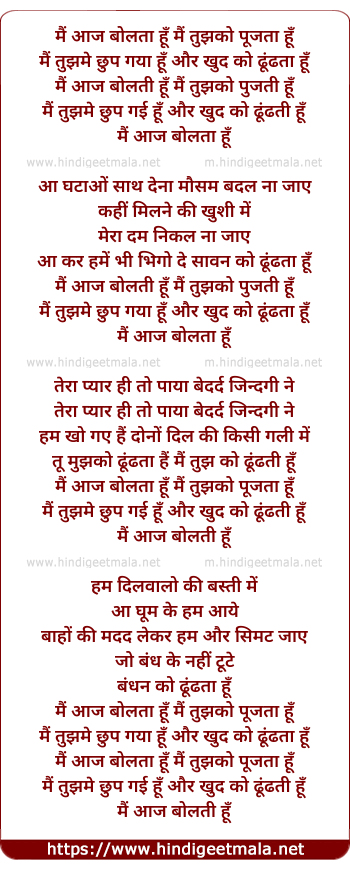 Lyrics of Mai Aaj Bolta Hu Mai Tujhko Poojta Hu - मैं आज बोलता हूँ मैं तुझको पूजता हूँ