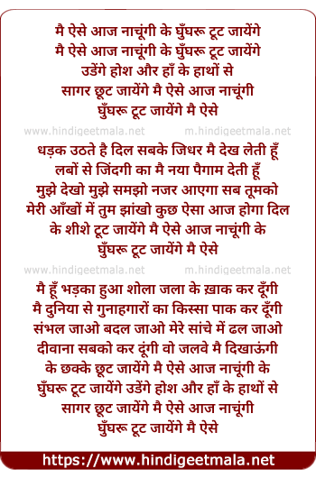 Lyrics of Mai Aise Aaj Nachungi Ke Guhnghru Tut Jaaynge - मै ऐसे आज नाचूंगी के घुँघरू टूट जायेंगे