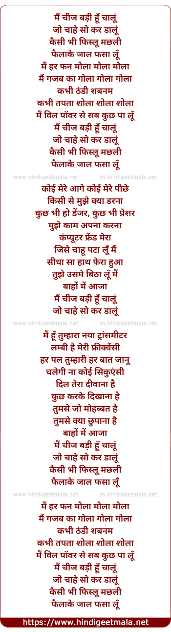 Lyrics of Mai Cheez Badi Hu Chaalu - मैं चीज बड़ी हूँ चालूं