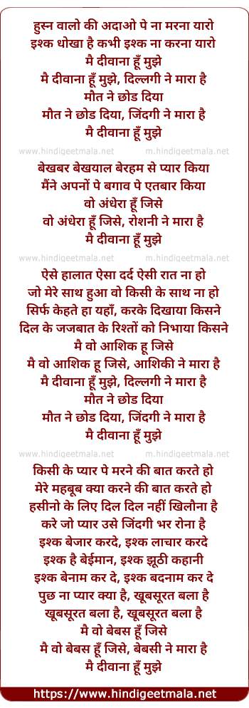 Lyrics of Mai Diwana Hu Mujhe Dillagi Ne Mara Maut Ne - मै दीवाना हूँ मुझे दिल्लगी ने मारा मौत ने